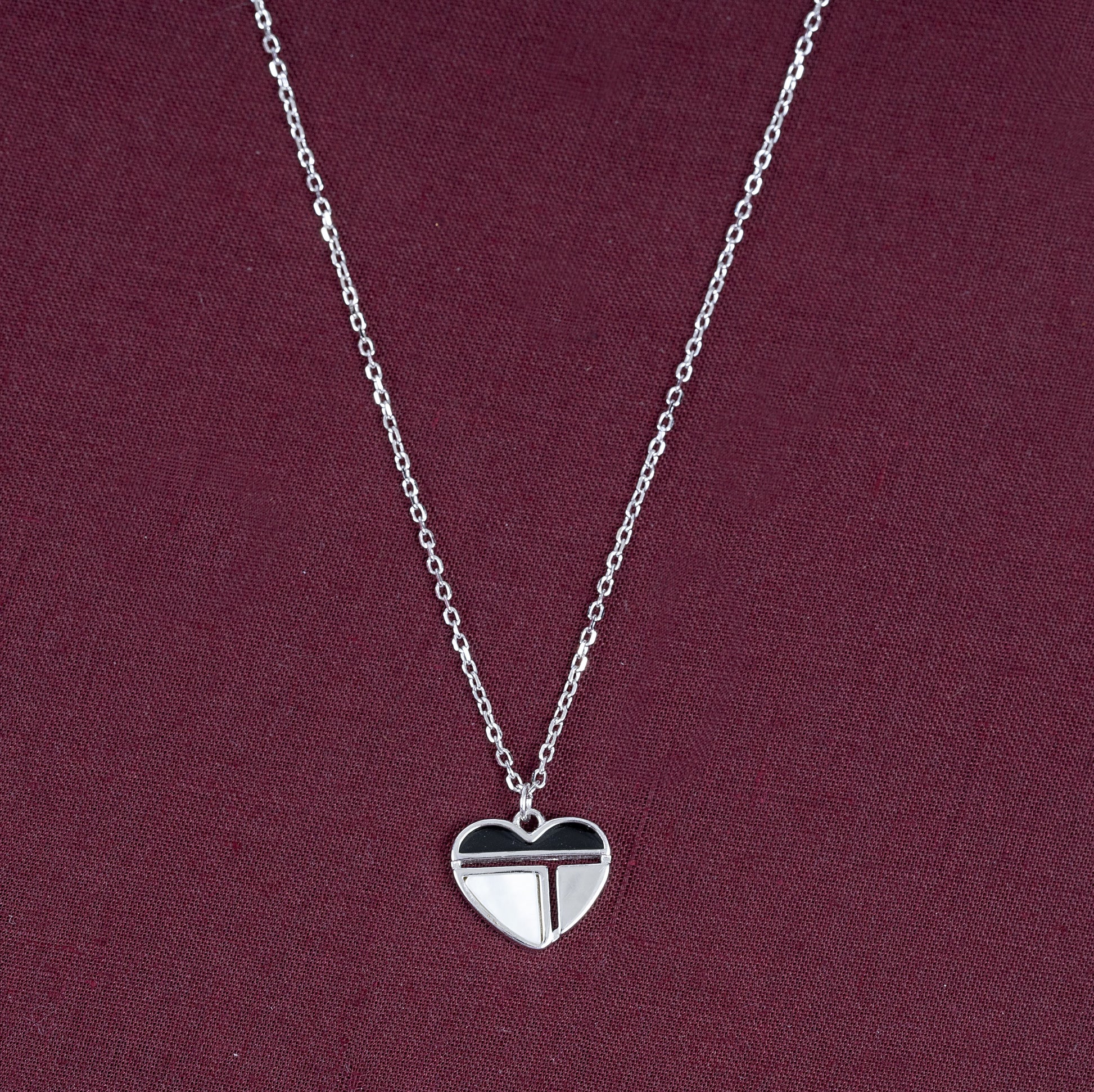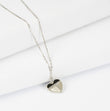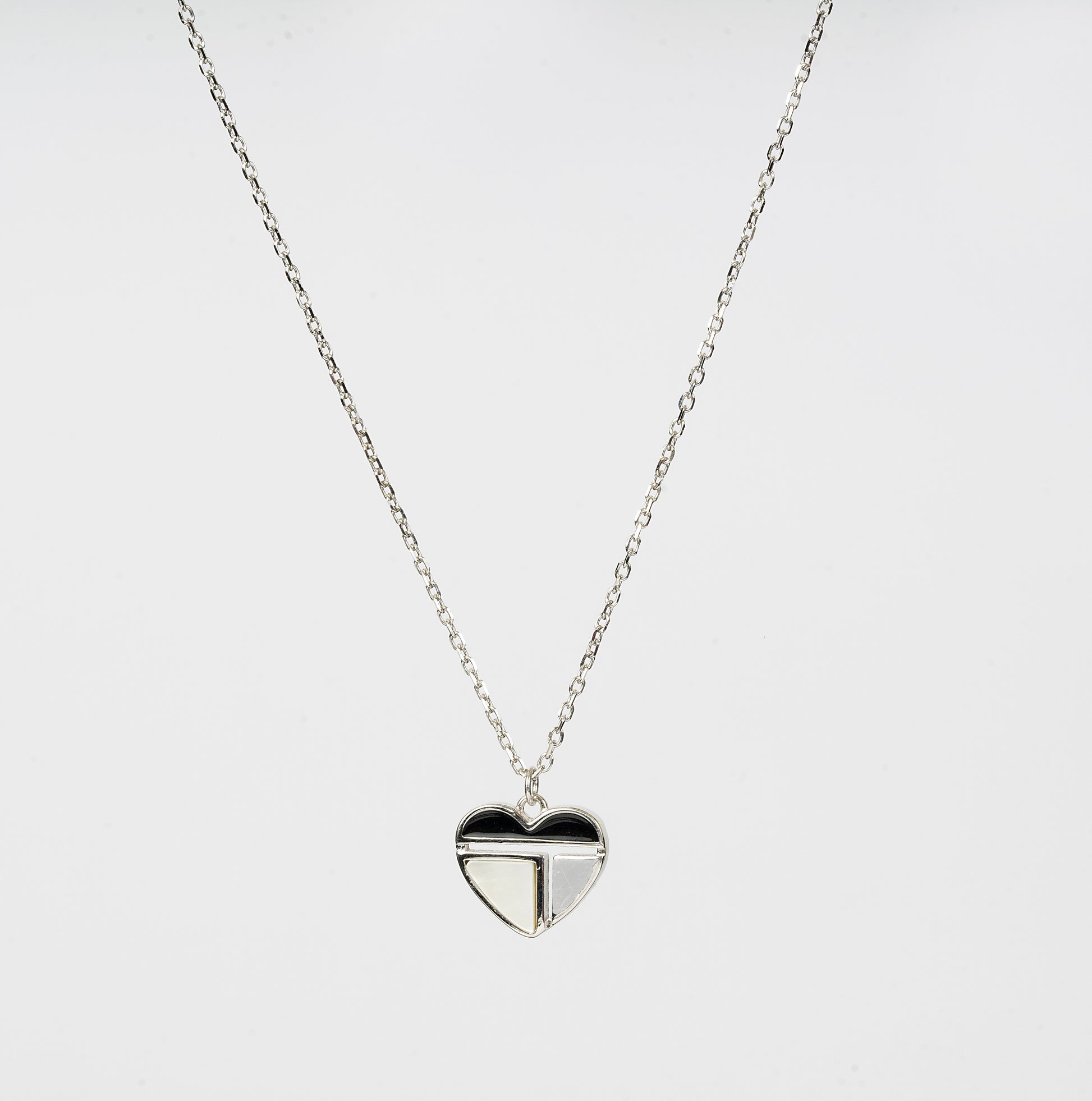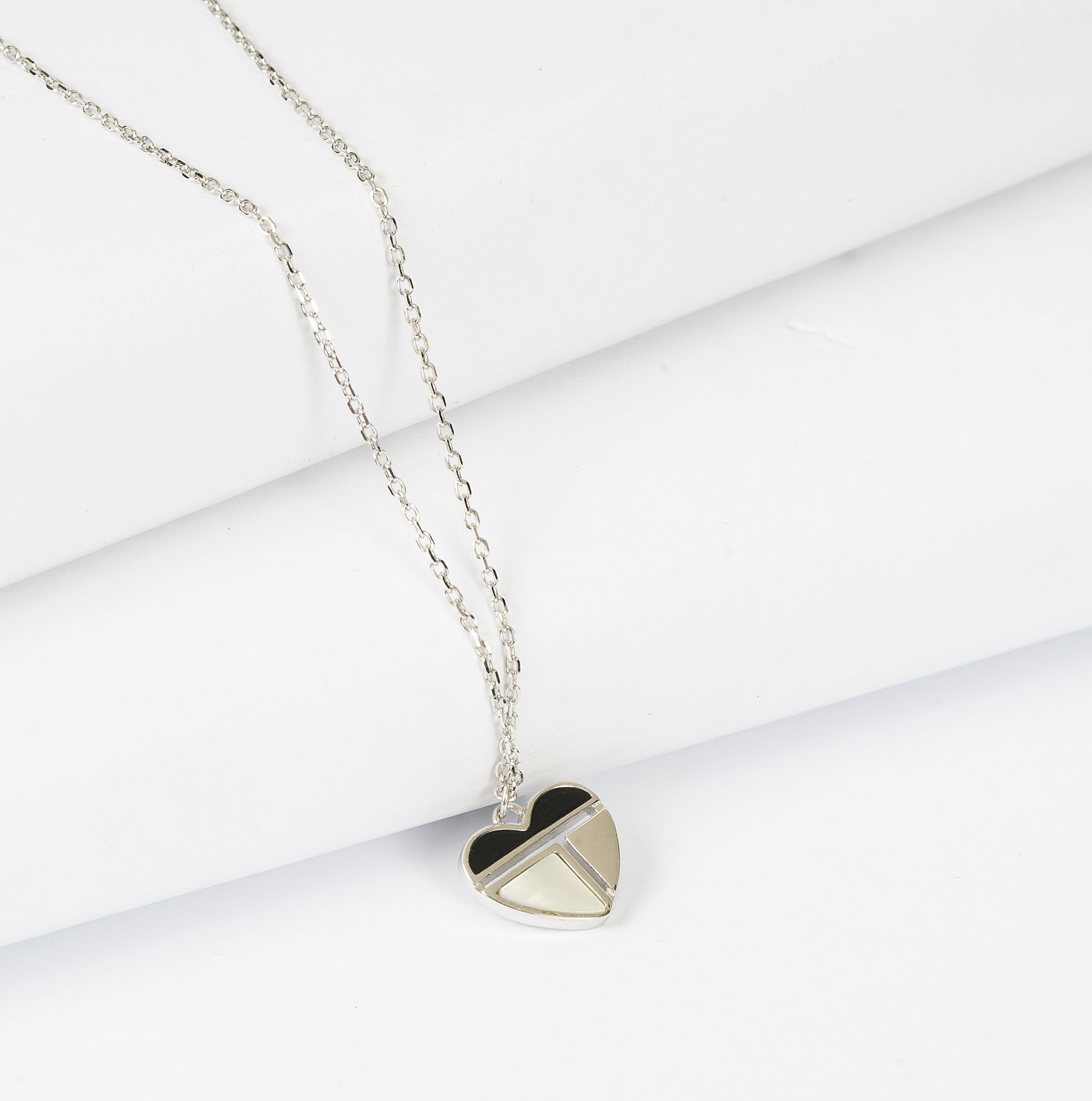 Elegant heart-shaped pendant with black enamel and Mother of Pearl.