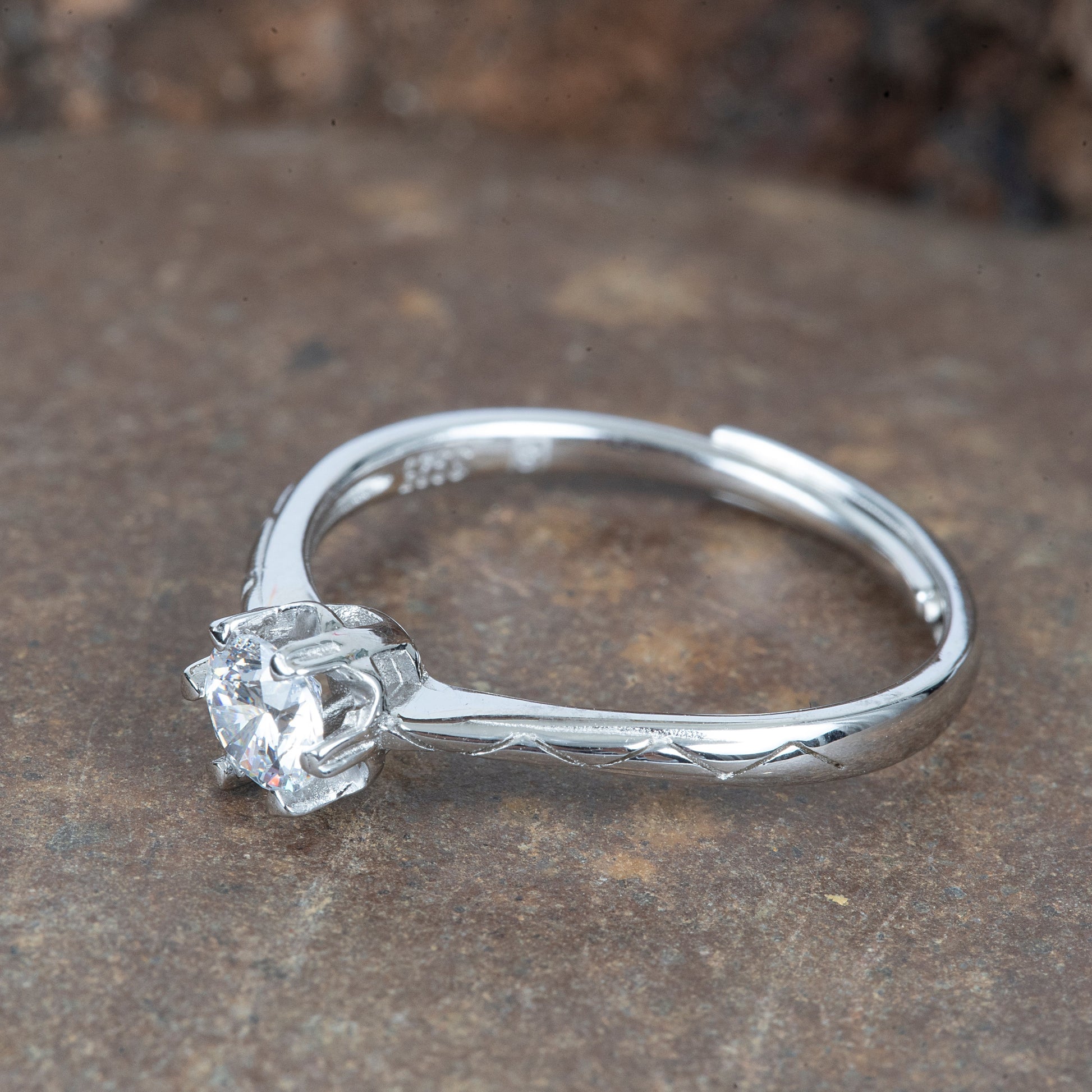 Features a single sparkling zircon solitaire as the focal point.