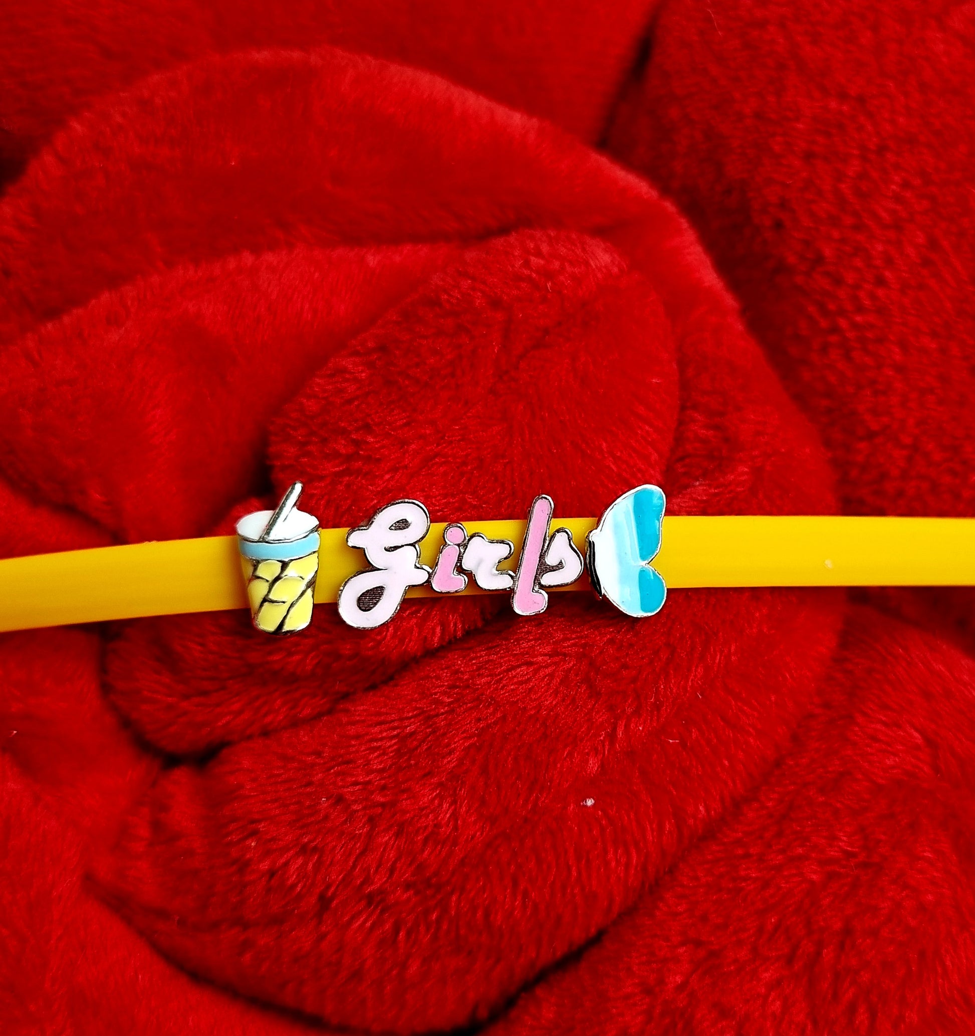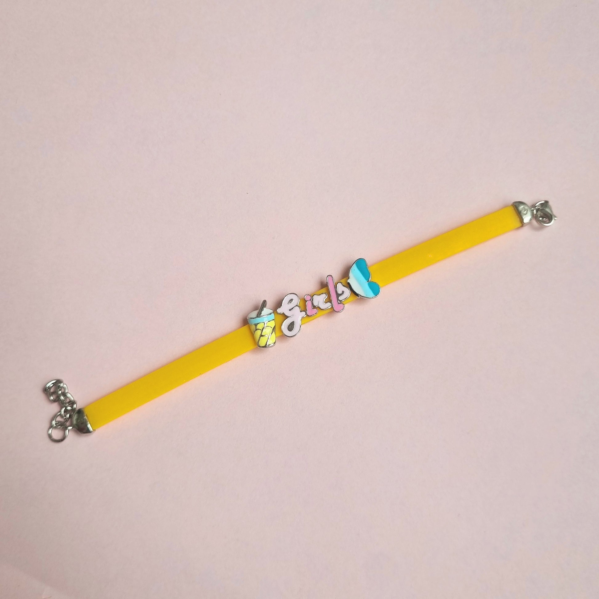 Features playful enamel charms – a butterfly wing and a colorful drink.