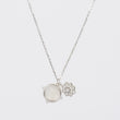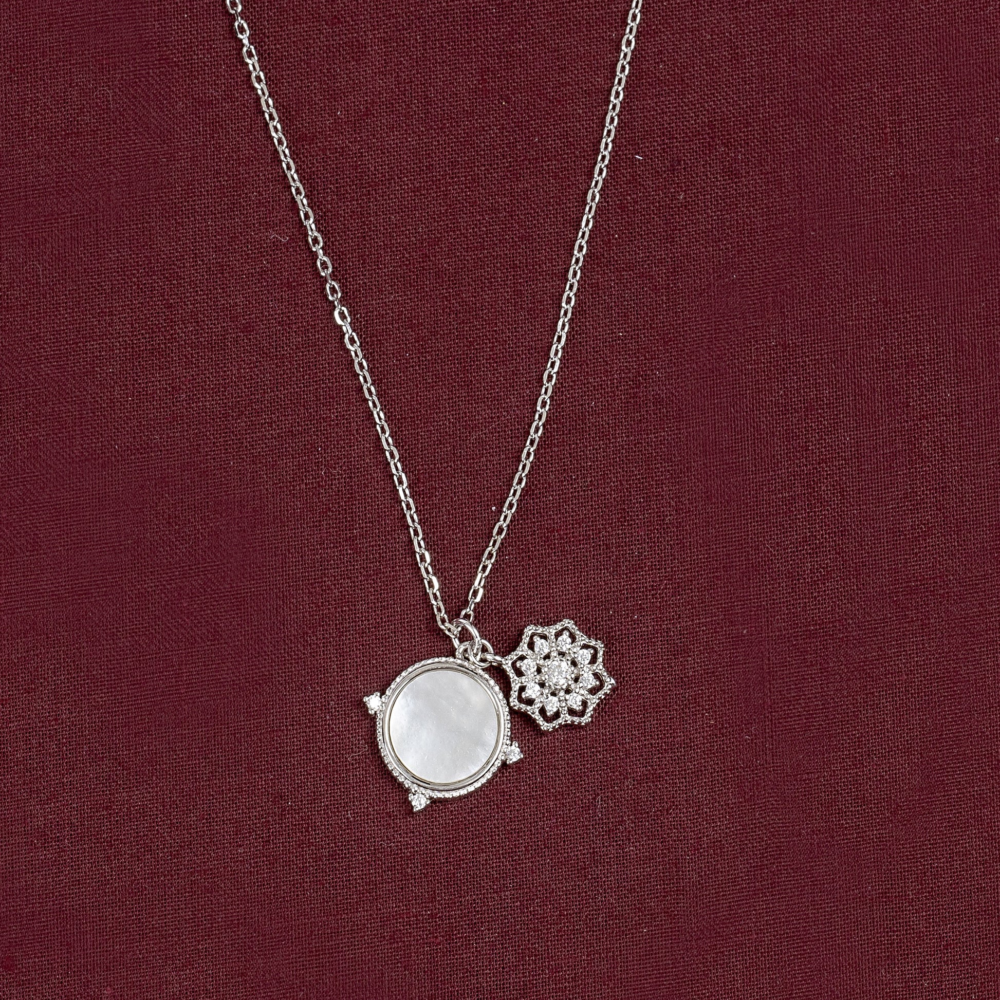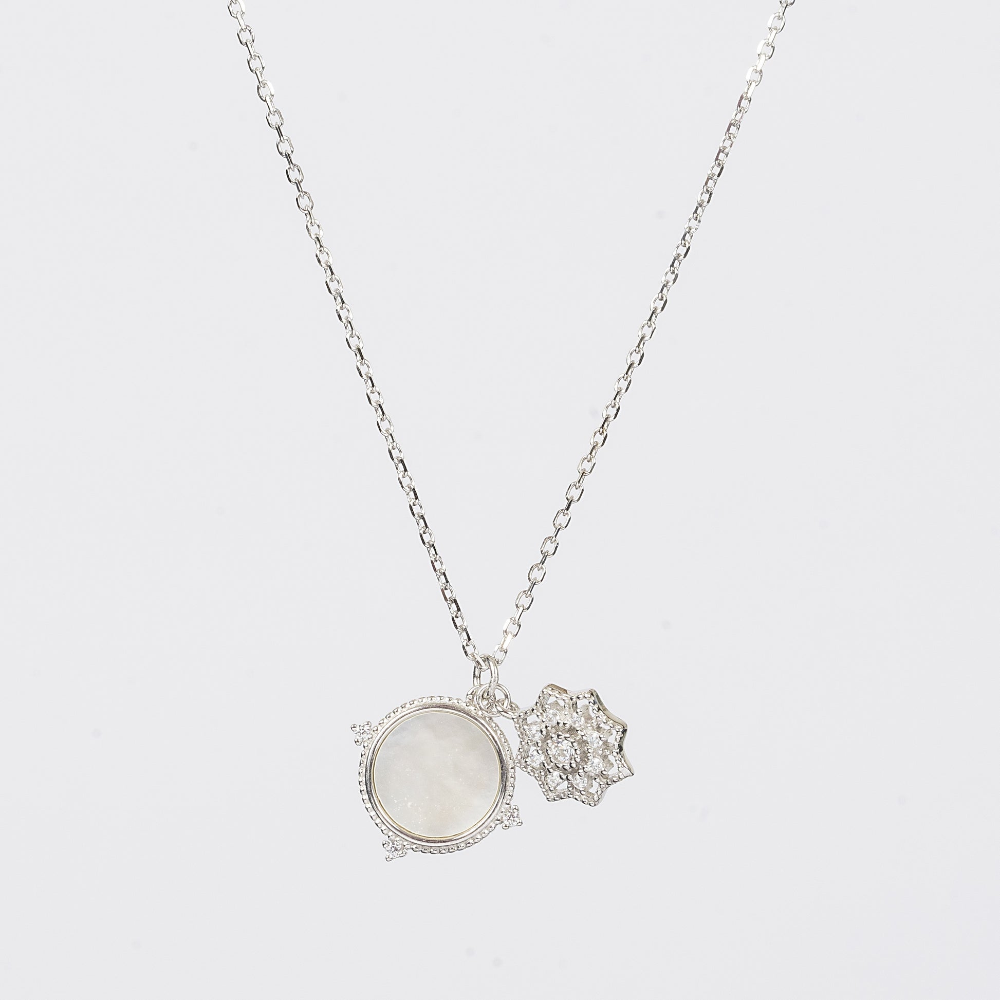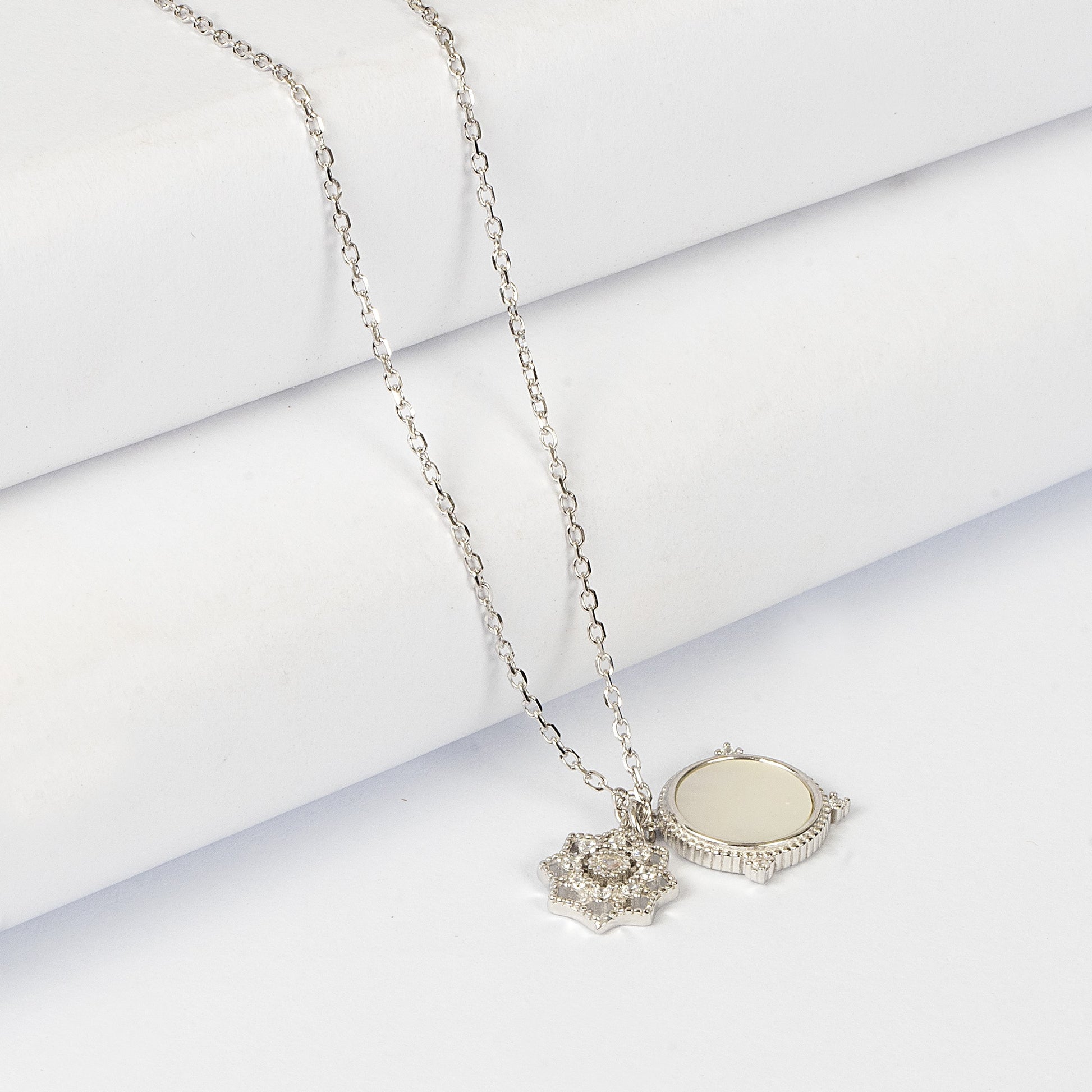 Elegant dual-pendant design with floral zirconia and Mother of Pearl.