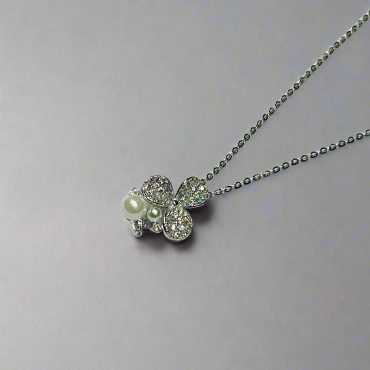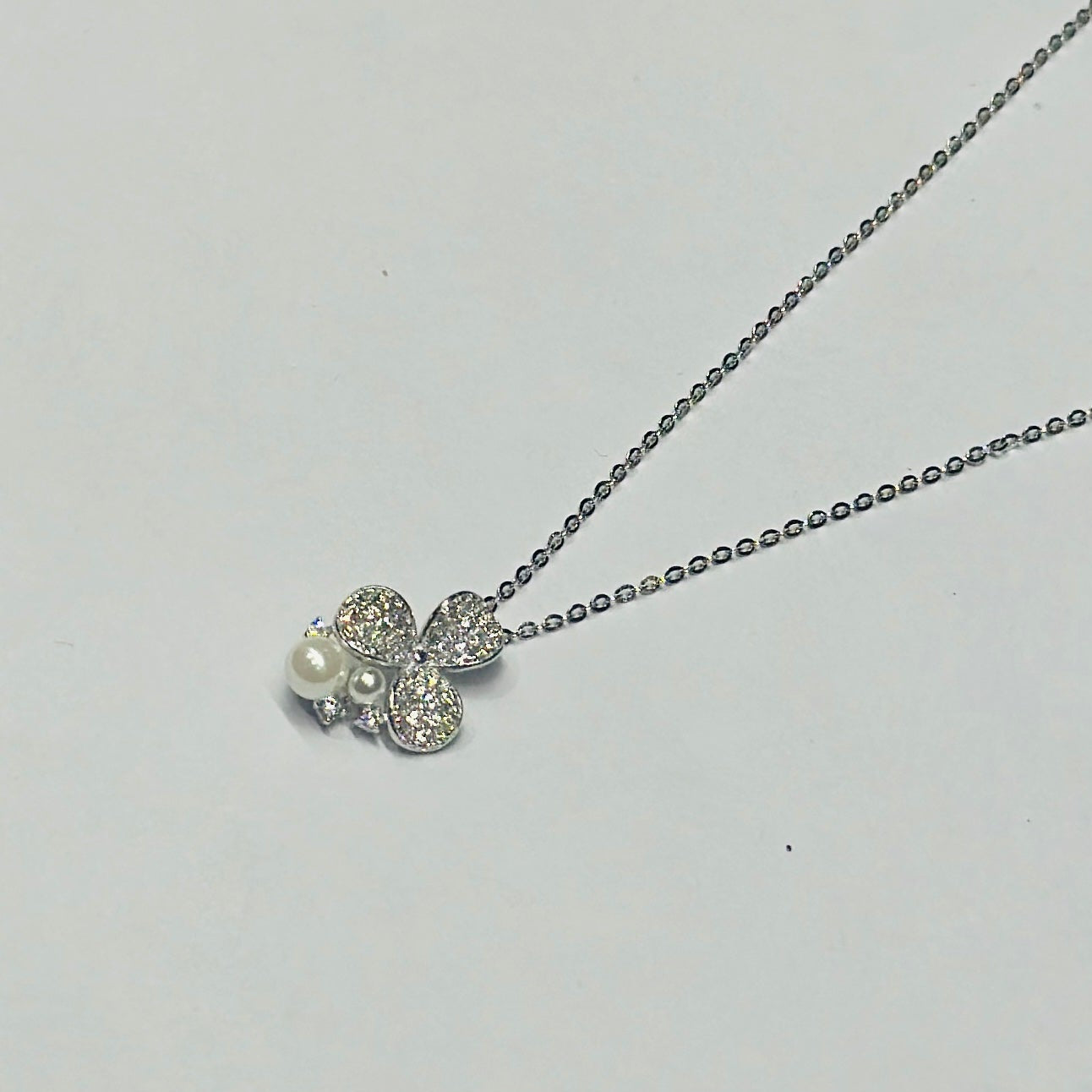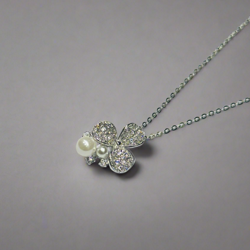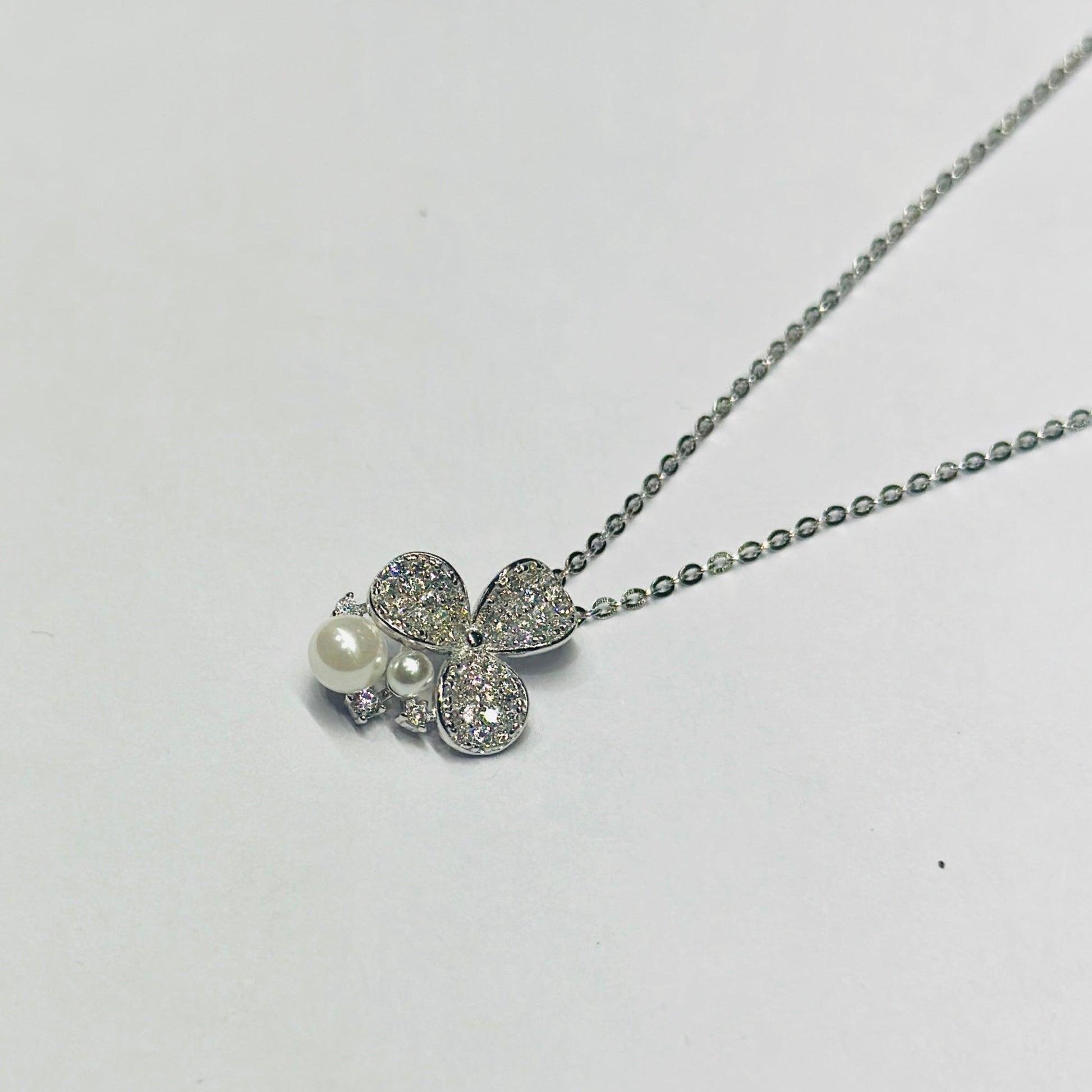 A Sterling Silver Pave Zircon Pearl Flower Pendant with Chain is a sophisticated and beautifully designed piece of jewelry. Here's a detailed description of this