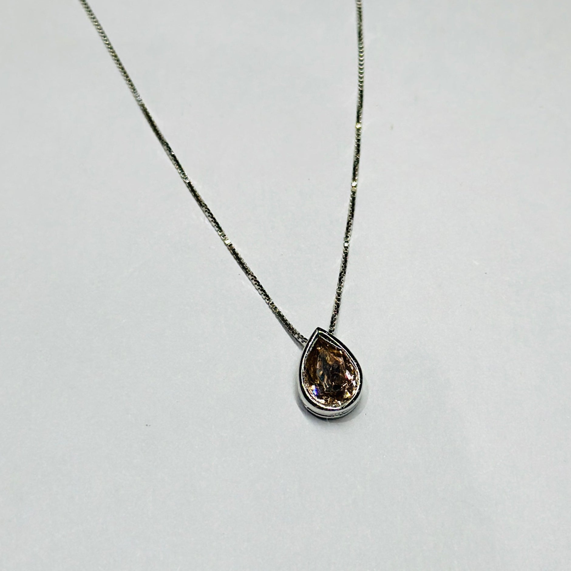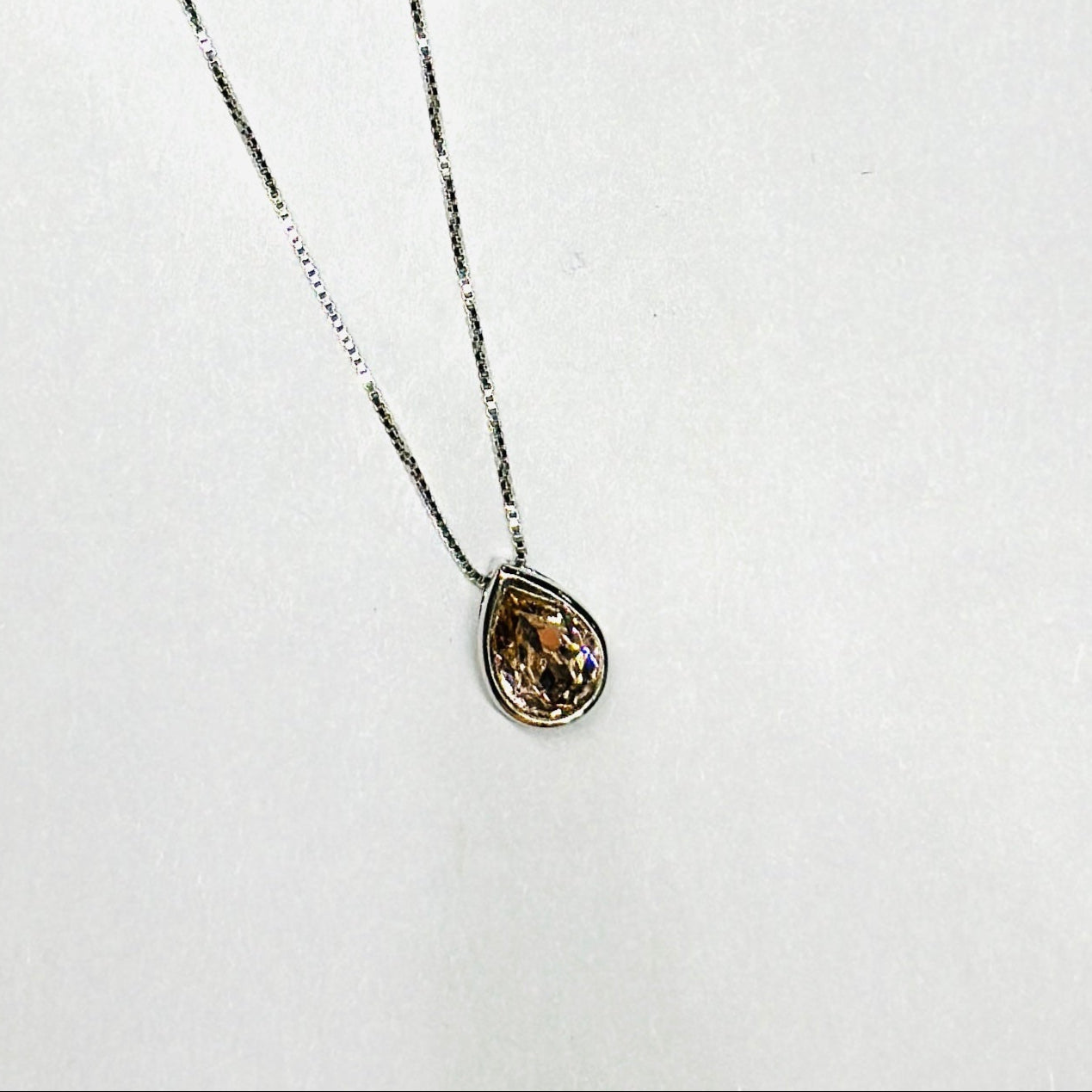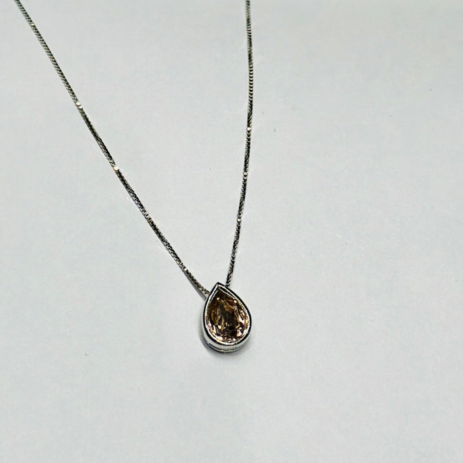 A sterling silver brown stone drop pendant chain features a pendant crafted from high-quality 92.5% BIS Hallmark sterling silver weight 1.9gm, paired with a crystal in a rich brown hue. The crystal is precision-cut, reflecting light beautifully to create a sophisticated and elegant appearance. The drop shape of the pendant gives it a graceful, elongated look, ideal for both casual and formal wear. The sterling silver chain that holds the pendant complements the crystal, enhancing its sparkle while maintaining a sleek, refined aesthetic. This type of jewelry adds a touch of luxury and timeless style to any outfit.