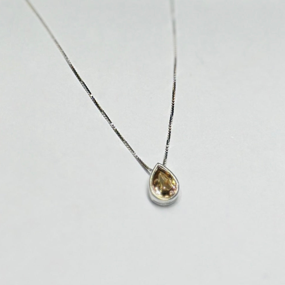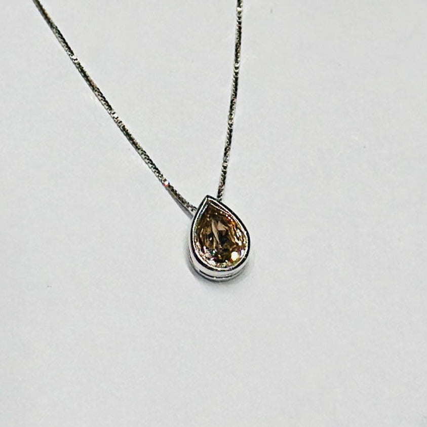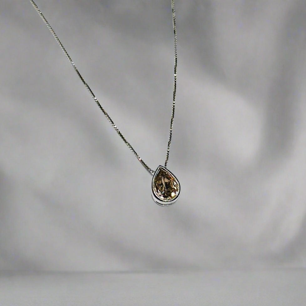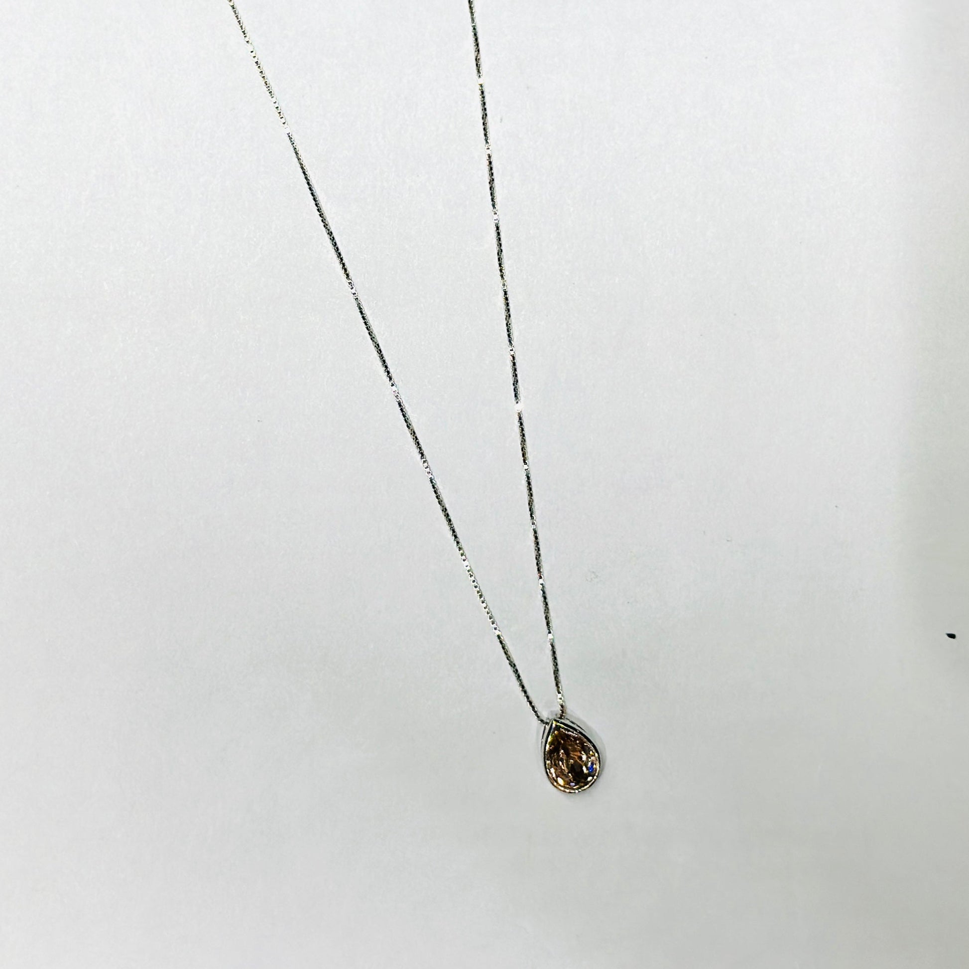 A sterling silver brown stone drop pendant chain features a pendant crafted from high-quality 92.5% BIS Hallmark sterling silver weight 1.9gm, paired with a crystal in a rich brown hue. The crystal is precision-cut, reflecting light beautifully to create a sophisticated and elegant appearance. The drop shape of the pendant gives it a graceful, elongated look, ideal for both casual and formal wear. The sterling silver chain that holds the pendant complements the crystal, enhancing its sparkle while maintaining a sleek, refined aesthetic. This type of jewelry adds a touch of luxury and timeless style to any outfit.